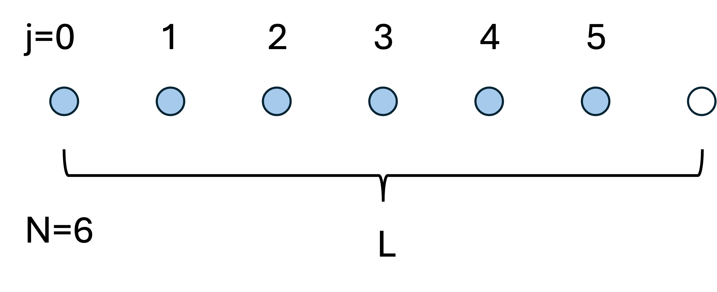 \[ \color{blue}{\rightarrow u_j = \sum_{n=0}^{N-1} c_n(t)e^{2\pi inx_j/L}} \]